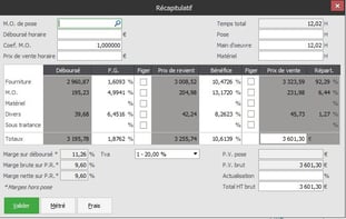Visualisez la rentabilité de votre devis ou facture. Le temps prévu, le total du déboursé ainsi que la marge.