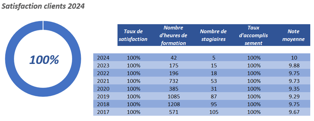 100% des clients ont été satisfaits de nos formations en 2024, aucun abandon n'a été constaté.